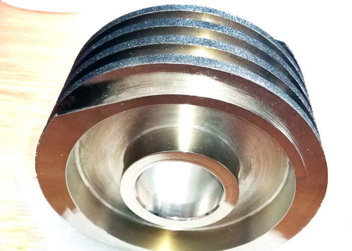 De elektrogeplateerde CBN slijpschijven die worden gebruikt voor het slijpen van keukenmessen zijn Ø165,1 mm en spiraalvormig, zodat ze elkaar overlappen en een vaste hoek van 30° vormen.